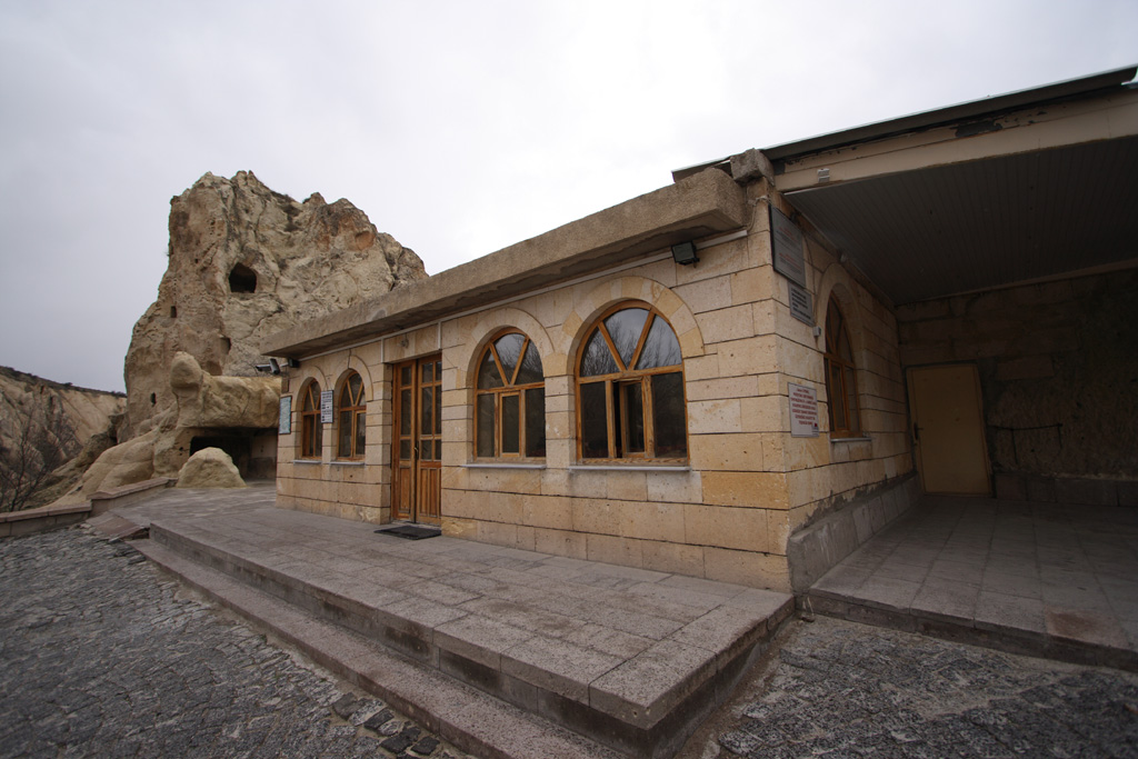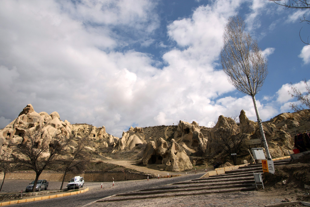 以下の写真は、ギョレメ野外博物館の入り口です。右側の白い木には、「Goreme Open Air Museum」のプレートが貼り付けられています。