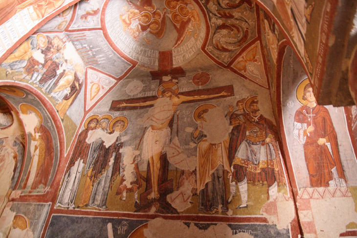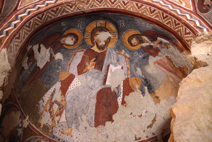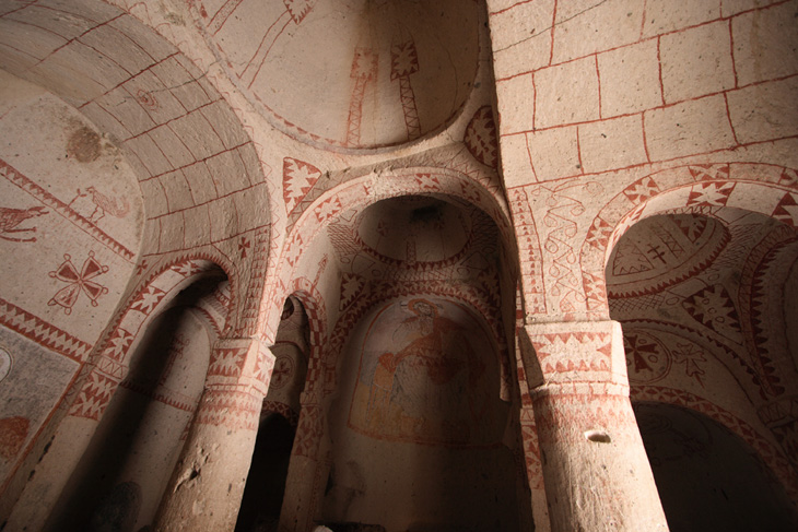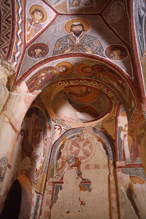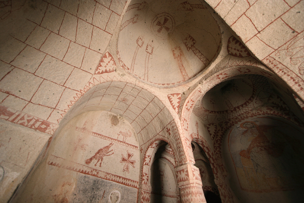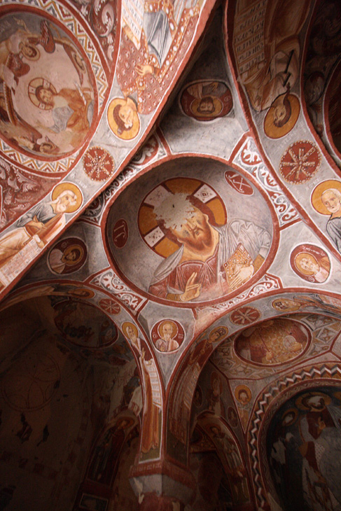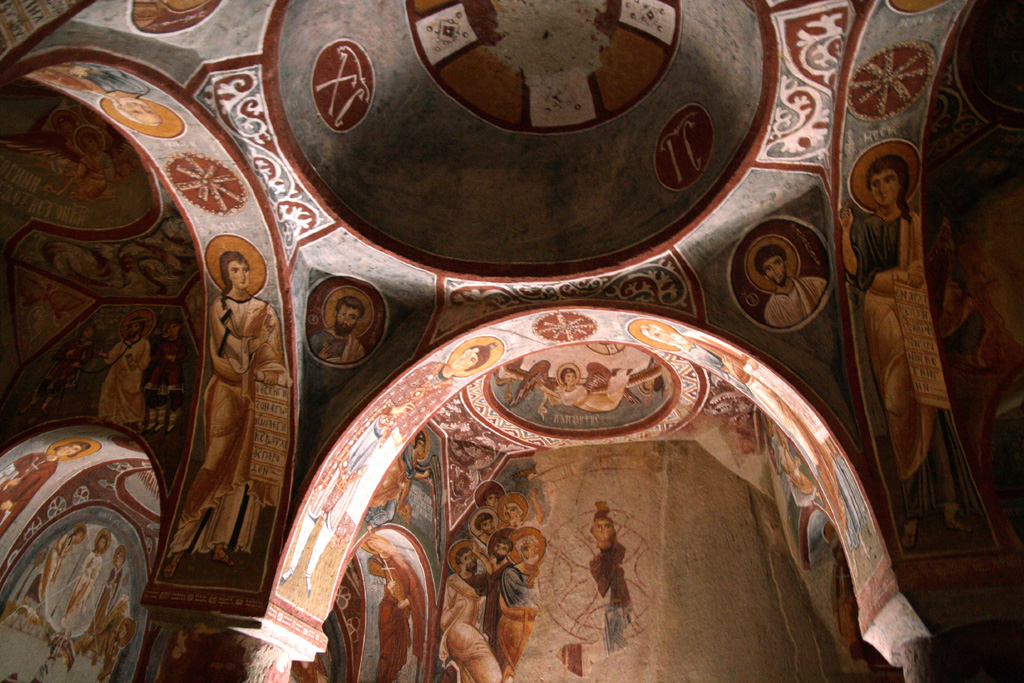 小さな入り口を抜けてまず最初に入った教会がリンゴの教会(エルマル・キルセ)です。教会は、4本の柱が丸い天井を支えており、赤い十字架と壁を縁取る幾何学模様から11世紀中頃から12世紀初頭のものだと推測されています。教会内には、たくさんのフレスコ画が描かれています。これらのフレスコ画はギリシャで見たフレスコ画とよく似ていて、カッパドキア様式ともいわれる芸術性の高いものです。