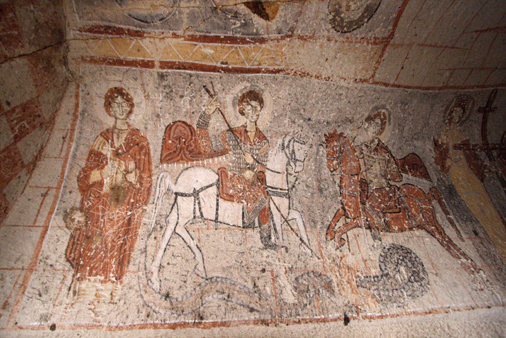 今度は、バジル教会に入ります。教会内では「馬に乗って大蛇と戦う聖ジョージと聖デメトリウス」のフレスコ画を見ることができます。因みに、バジルとは4世紀にカイセリに生まれ、後に修道派を設立した神学者の名前だと言われています。