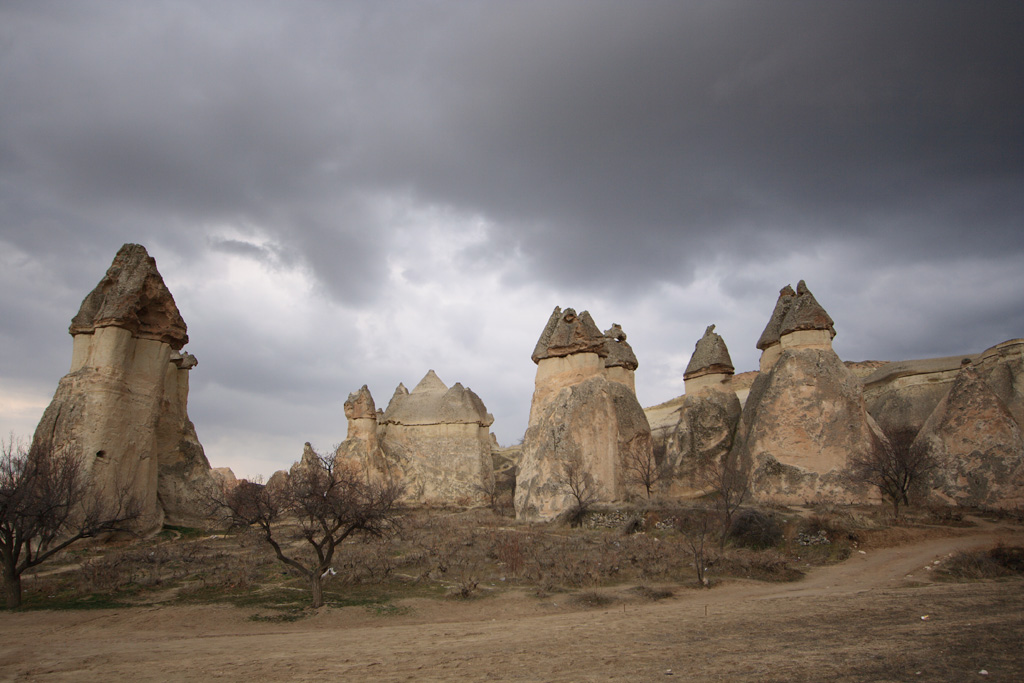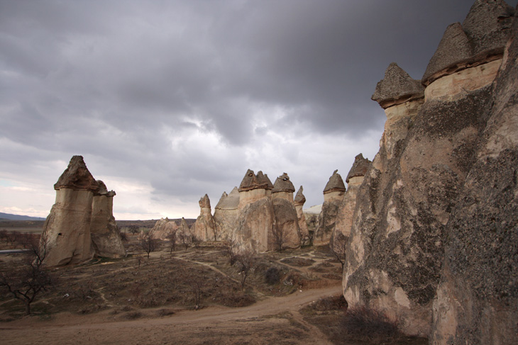 洞窟レストランを発ち、次に向かうのは、カッパドキア観光のハイライトスポットであるパシャバー地区のゼルベの谷です。パシャバー地区には有名な「キノコ岩」が立ち並び、煙突の形に似ているこれらの岩は中に妖精が住んでいるという言い伝えから「妖精の煙突」ともいわれています。バスの車窓からゼルベの谷の奇岩群が見えてきました。