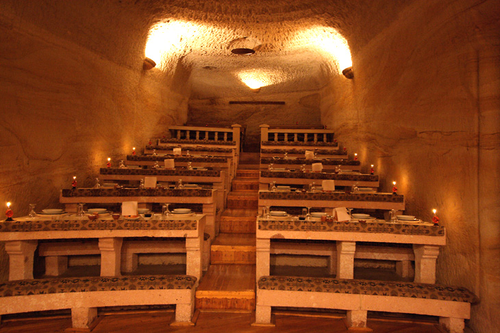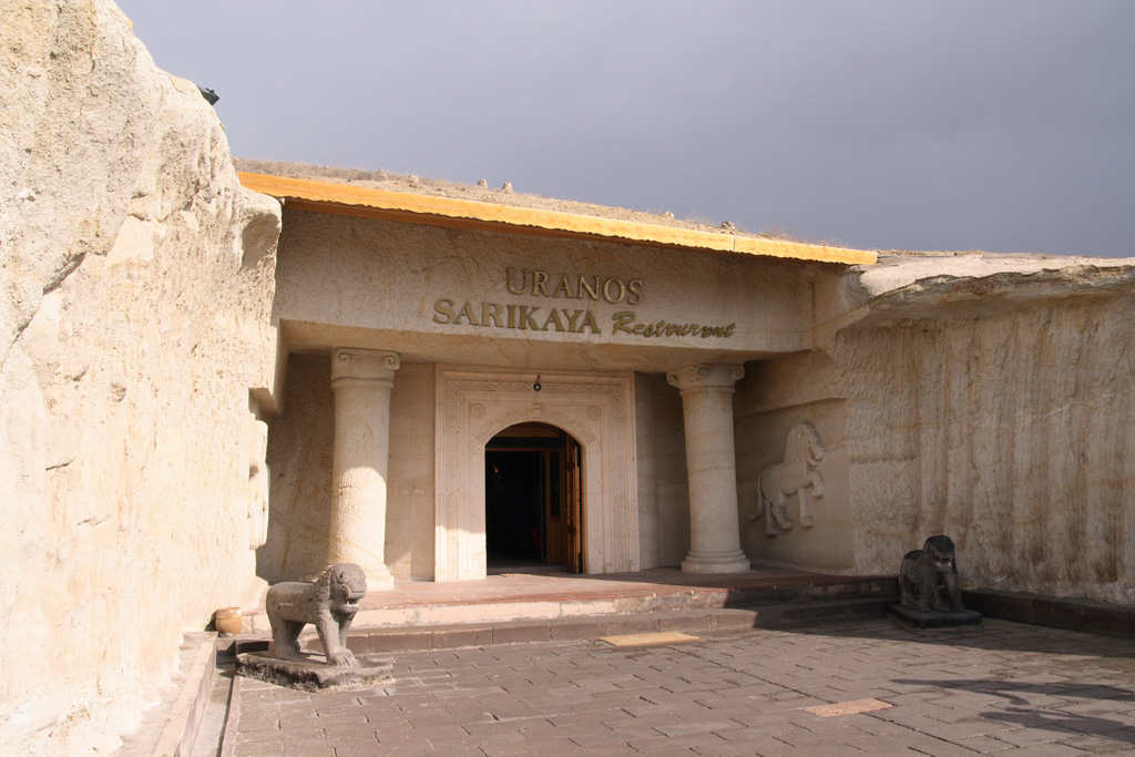 ギョレメ野外博物館をでて、洞窟レストランのURANOS・SARIKAYAレストランに到着。カッパドキアのレストランには、リーズナブルなレストランが多く、洞窟や岩山を改造したレストランや、奇岩を眺められるレストランなどがあるのが特徴です。