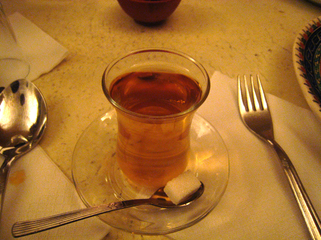 アップルティーです。このグラスは、チャイセットと呼ばれるものでトルコ中どこに行っても見つけることができます。お土産屋さんでもチャイセットとして売られています。トルコ人の生活に欠かせない「チャイ」と呼ばれるトルコ風紅茶や「アップルティー」をお店で注文すると、大抵はこのチャイセットで出されます。「チャイ」は、紅茶の葉を煮たてたものをお湯で薄めたもので、好みに応じて砂糖を入れて飲みます。