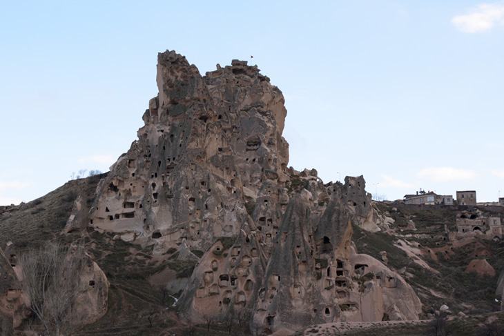 ウチヒサールの要塞を望遠で撮ってみました。岩の上部にある小さな穴は、ハトの糞を集めて、肥料にするための「ハトの家」です。