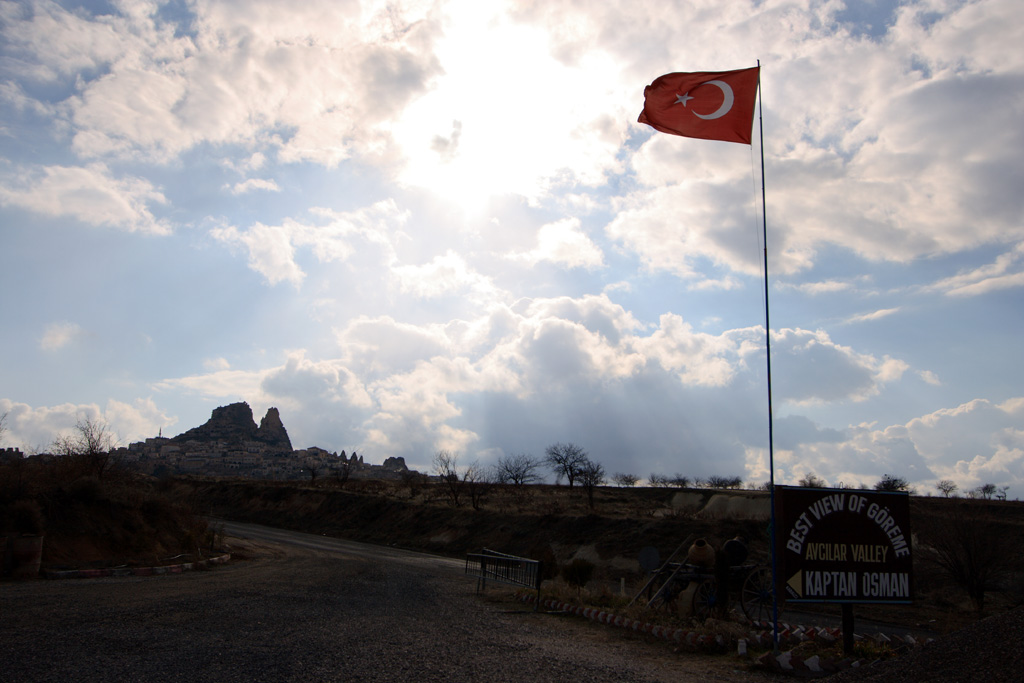 展望台の後は、ウチヒサールの要塞へと向かいます。ウチヒサールは、カッパドキア地方で最も高いところに位置する村で、村の中央にそびえる大きな岩の要塞がシンボルとなっています。以下の写真は、遠景から見たウチヒサールです。トルコ国旗が風に揺られてなびいています。