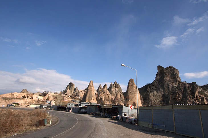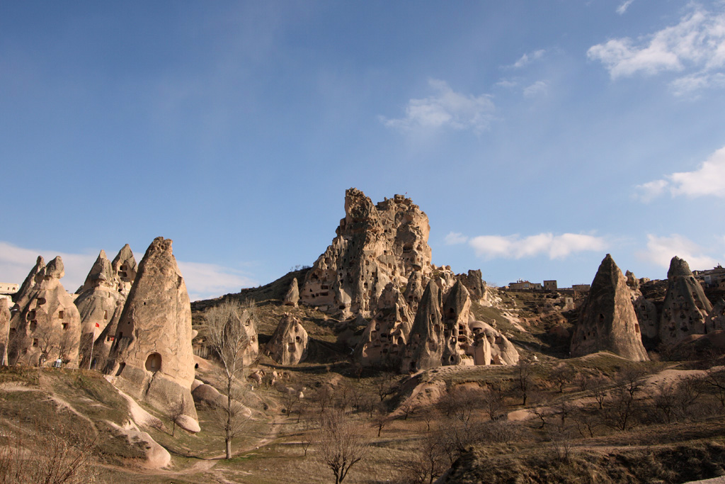 正面にウチヒサールの要塞が見えます。要塞の頂上からは360度のパノラマが一望できますが、今回は頂上までは登りませんでした。要塞の周囲には、岩をくりぬいた住居があり、現在もなお使われています。因みに、ウチヒサールとはトルコ語で3つの要塞の意味です。