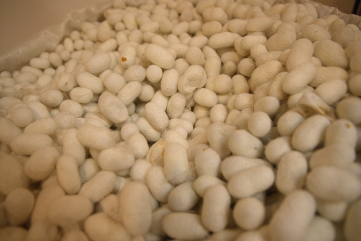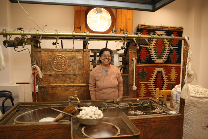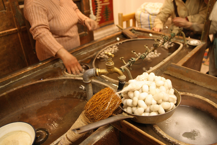 次は、絨毯を織る時に使う蚕の繭から糸を紡ぐ工程を見せてくれました。