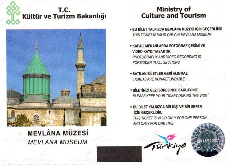 メヴラーナ博物館に到着しました。メヴラーナ博物館は、独特の旋回舞踊で世界的に有名なメヴラーナ教団の総本山だったところです。メヴラーナとは、「我が師」という意味で、教団創始者であるジェラルディン・ルーミーのことを指しています。以下は、メヴラーナ博物館の入場券です