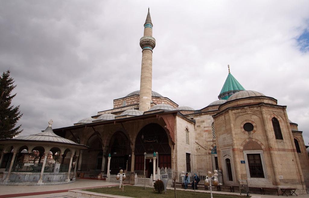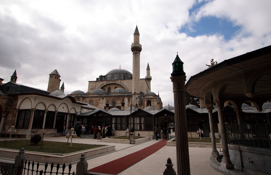 博物館の入り口をくぐると、目の前にメヴラーナ博物館が見えてきます。建物が大きすぎて超広角レンズでないと入りきりません…。メヴラーナ博物館は、夜になるとライトアップされます。トルコ石の色に似た緑タイルのとんがり屋根を持つ塔が印象的で、コンヤのシンボルとして親しまれています。空が青空だったら青タイルの屋根がより一層映えたかもしれません。いや、もしかしたら曇りの時のほうが色が映えるのかもね。