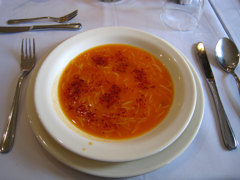 昼食で1番最初に出てきたのはスープ。ぴり辛の赤唐辛子を入れるとさらに美味しくなります。