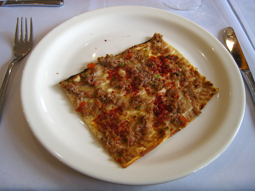トルコピザです。トルコ滞在中に食べた食べ物の中で1番おいしかったです。ピザにも唐辛子を乗せて、さらに春巻きのようにグルグルと巻いてパクッと食べます。すんごくおいしかったです。