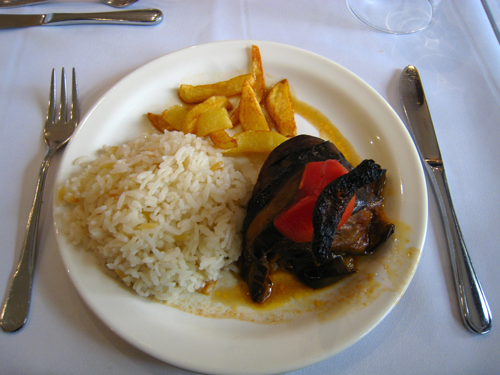 メインディッシュです。ご飯にポテトにナスです。トルコのお米は、日本のお米のように柔らかくなくてパリパリした食感がします。日本のお米に慣れてしまっていると、トルコのお米を美味しいとは感じられないかもしれません。