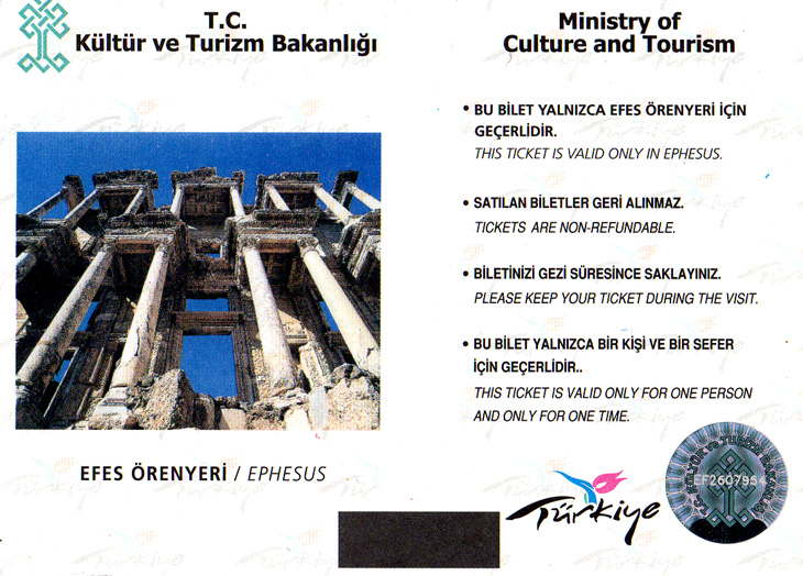 エフェソス(エフェス)遺跡入り口付近に到着。この遺跡は、本によって「エフェソス遺跡」、もしくは「エフェス遺跡」と表記されている場合があります。どちらの呼び名で呼んでも構いません。ここでは以後、エフェソス遺跡と表記していきます。以下は、エフェソス遺跡の入場券です。