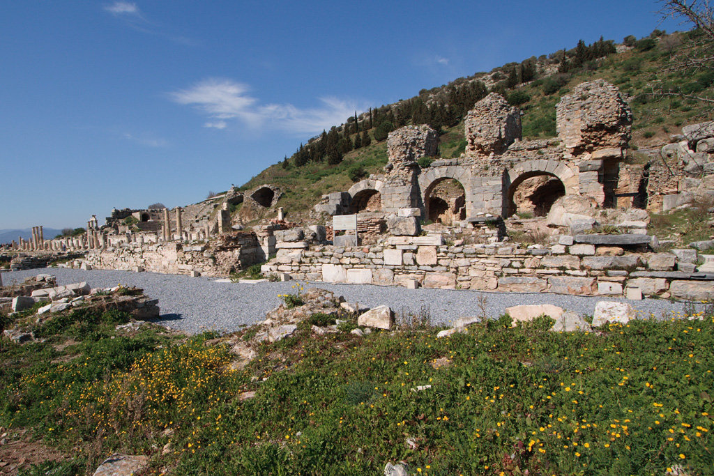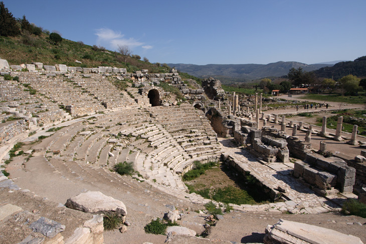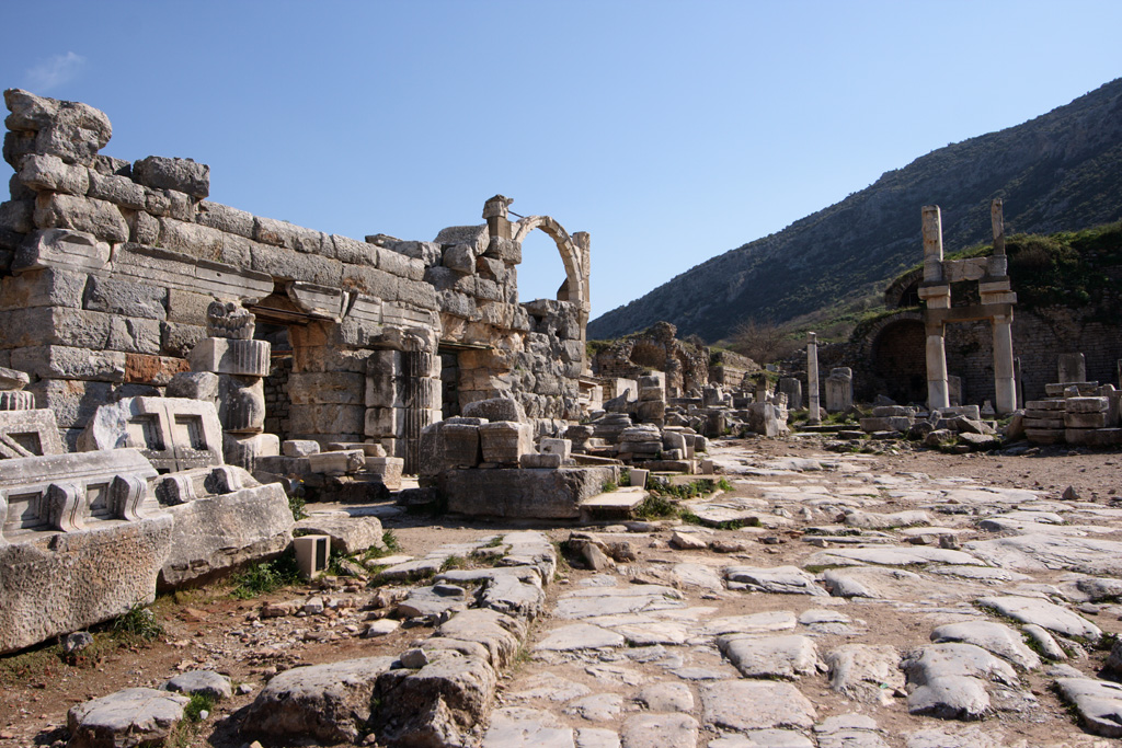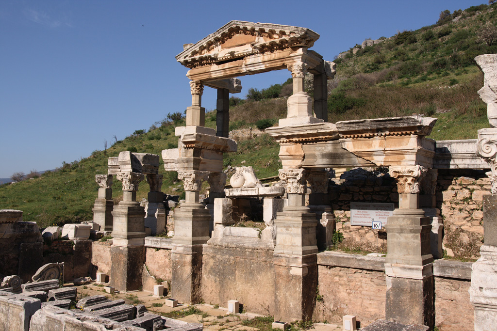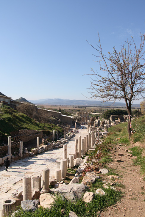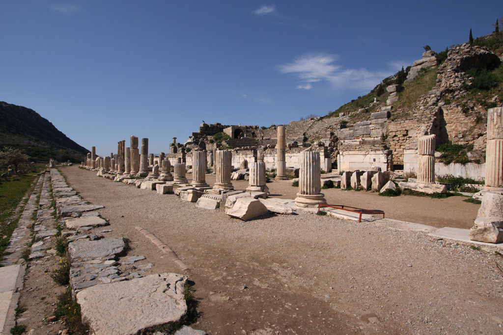 エフェソス遺跡には、南側入り口と北側入り口のどちらからでも入場する事ができ、南側入り口から入場すると、全体的に下りなので楽です。日陰になる場所がほとんどないので、帽子、サングラス、飲料水などを用意しておいたほうがいいと思います。