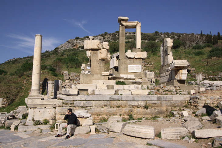 少し先に歩くと見えてくるのが、メミウスの碑です。手前で携帯電話で話している人は、現地トルコ人ガイドのアリさんです。