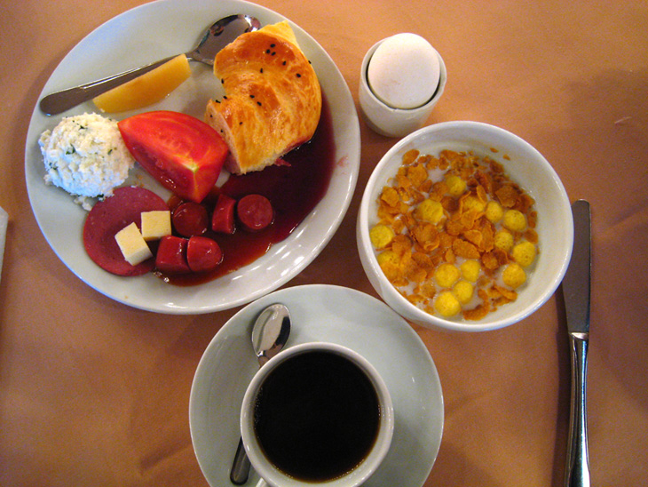 5時45分頃起床、荷物出しをして6時30頃に朝食をとります。朝はバイキングです。