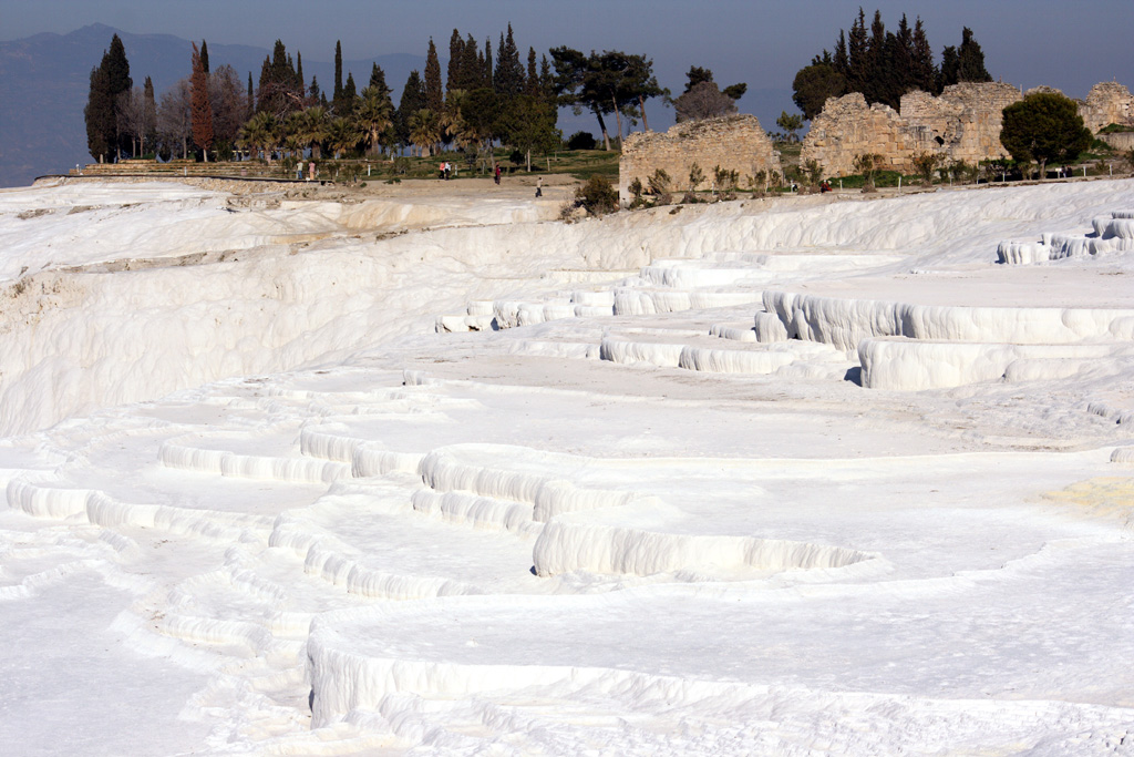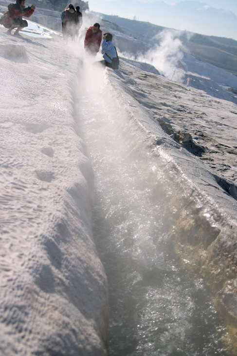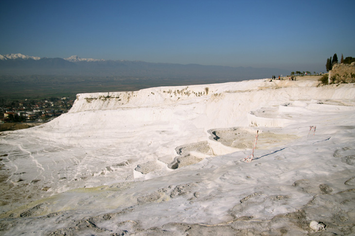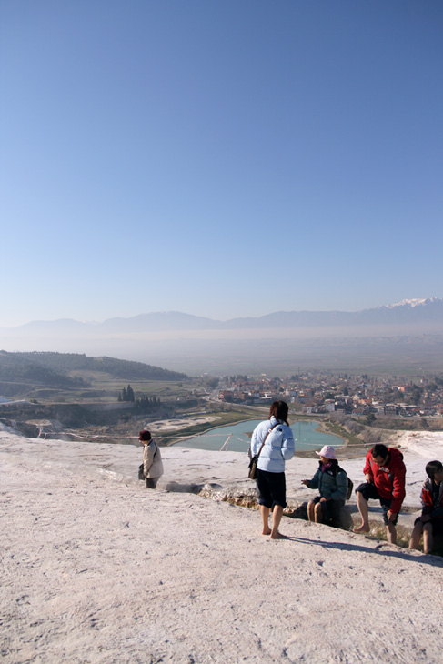 眩しいぐらい真っ白です。パムッカレは、上から見るとあまり迫力がありません。下に降りていって下から上を見上げると段々畑のような棚になっているのがすぐにわかります。
