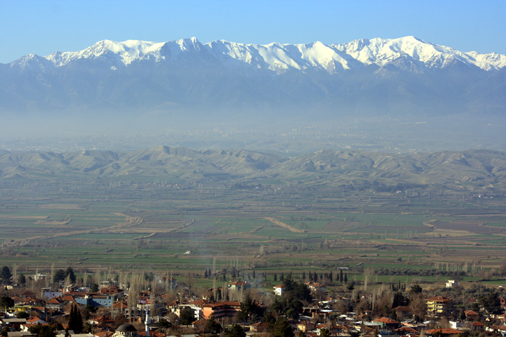 雪を戴いた山を望遠で撮ってみました。写真手前に見えるモスクがトルコらしい風景を象徴しています。