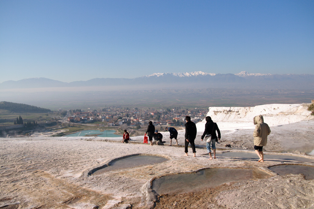 足湯をするためには石灰棚の上を裸足で歩いていかなければいけないのですが、その石灰棚の上がとても痛いです。また、場所によっては冷水のところもあって冷たすぎて歩けない場所もあります。冬のパムッカレでは、温かいお湯が流れているところを歩くようにしましょう。