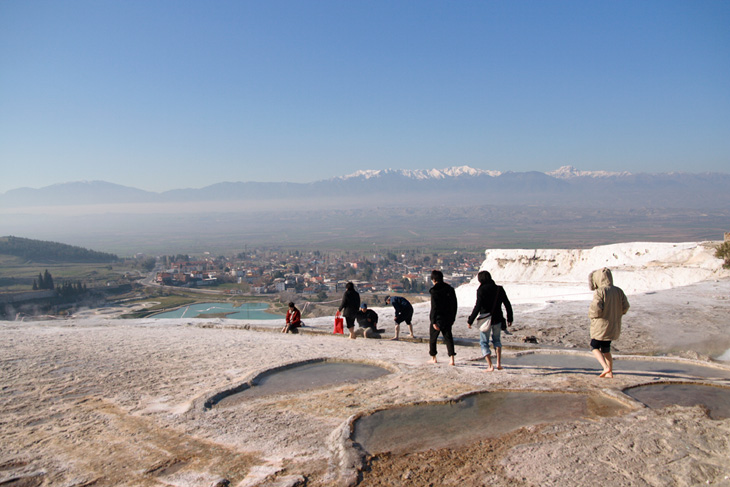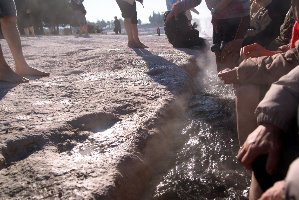 次は、パムッカレに湧く温泉で足湯に浸かりに行きます。パムッカレでは、石灰棚の保護のため地面を裸足であるくことが義務付けられているので靴と靴下を脱いで石灰棚の上を歩いていきます。