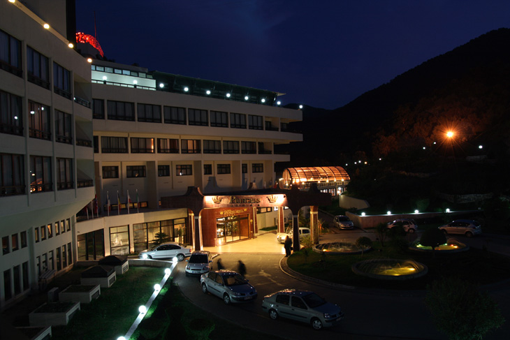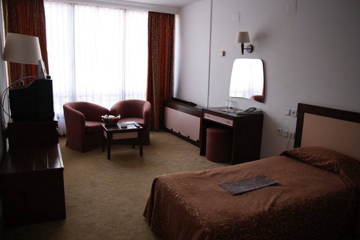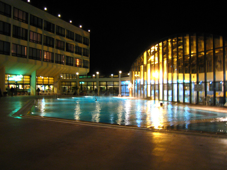 今日のホテルでは、温泉プールとハマムが無料で利用する事ができたので、食後に行ってみました。写真は、野外の温泉プール。僕が行ったのは、室内の温泉プールでした。ハマムとは、トルコの伝統的なトルコ風呂のことで、大理石で出来た巨大なサウナの上に複数人が同じ場所で寝転がります。大理石の上に仰向けになってじっとすること15分程度。徐々に背中が温かくなってきて、しばらくは体がポカポカした感じになります。イメージ的には、岩盤浴を想像してもらえばわかりやすいかと思います。