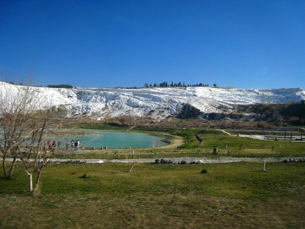 パムッカレを出発して数分後、先ほどは上から見ていた溜め池(?)とパムッカレが今度は下から見えています。