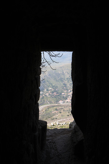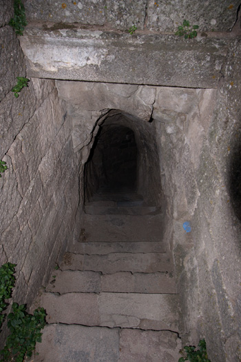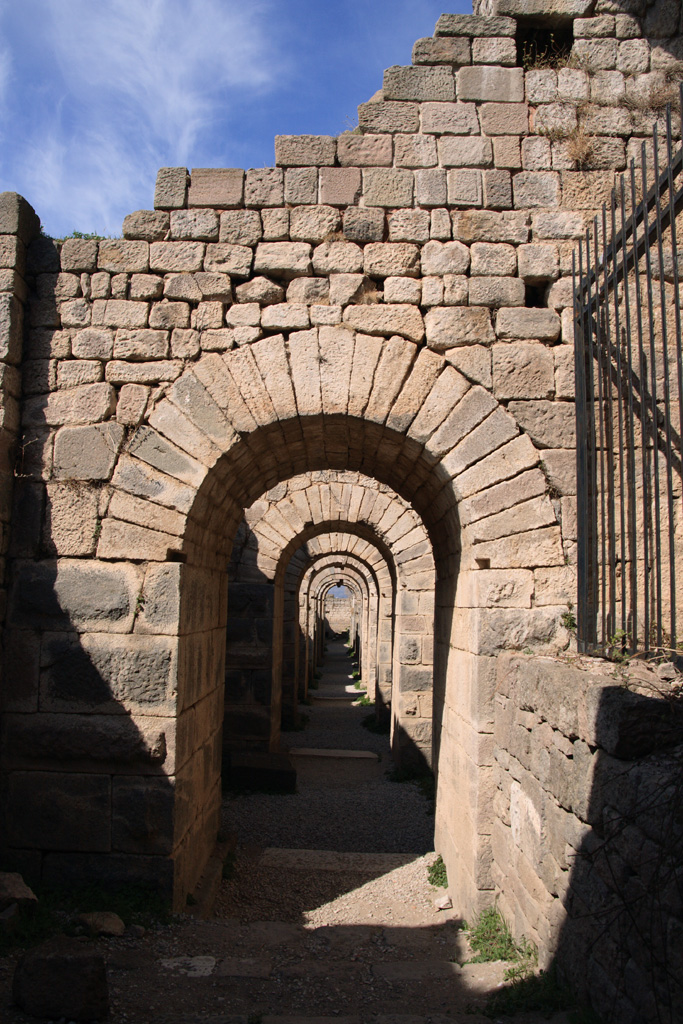 最後に大劇場を降りて行きます。この大劇場は、丘の南西斜面に造られ、斜度は数ある古代遺跡の劇場の中でも1番急な劇場です。この劇場から、ベルガマの町を一望する事ができます。まずは、狭い通路の中をくぐって劇場の入り口まで行きます(左写真)。右写真では、そのまま崖下にまっさかさまに落ちてしまいそうな出口が見えています。ドキドキ…。