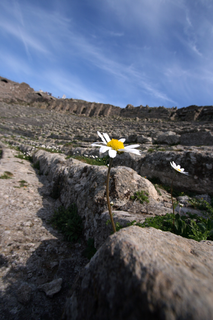 この大劇場にもたくさんのお花が…遺跡にはお花がよく似合います。遺跡の中にお花を見つけると、聖闘士星矢の世界を思い出します。