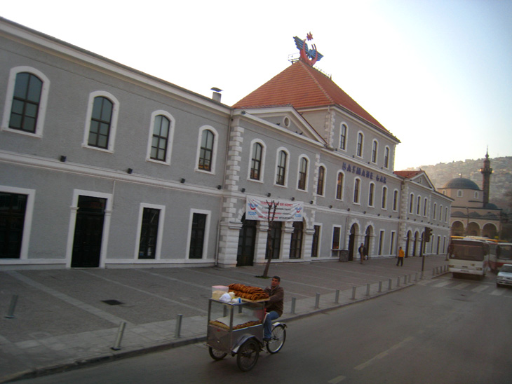 バスの中から見えたイズミールのバスマネ駅(BASMANE GAR)。自転車でパンを運ぶおっちゃんの姿がいかにも異国らしい。