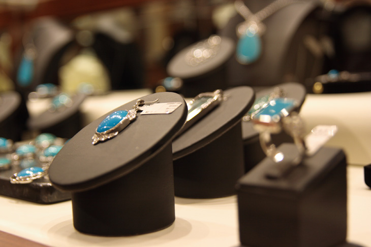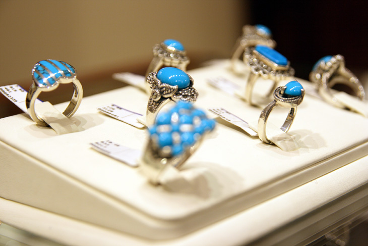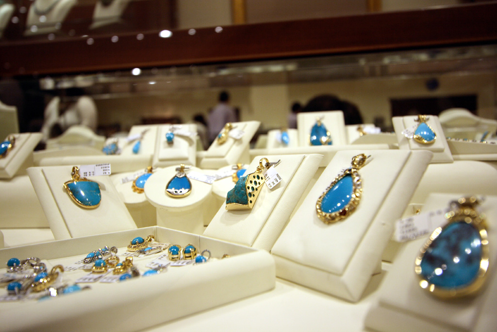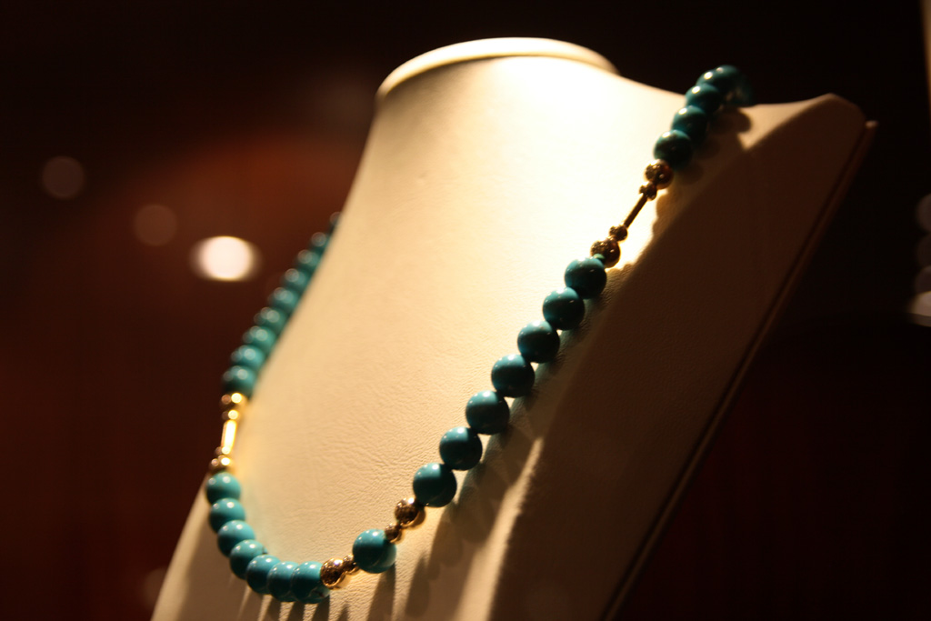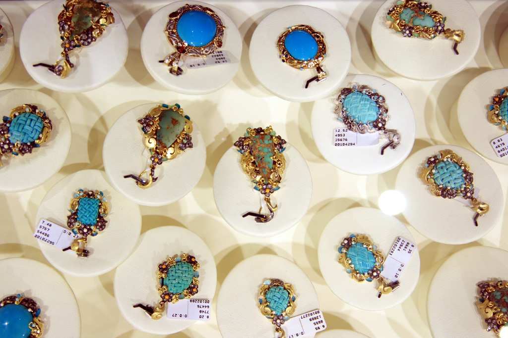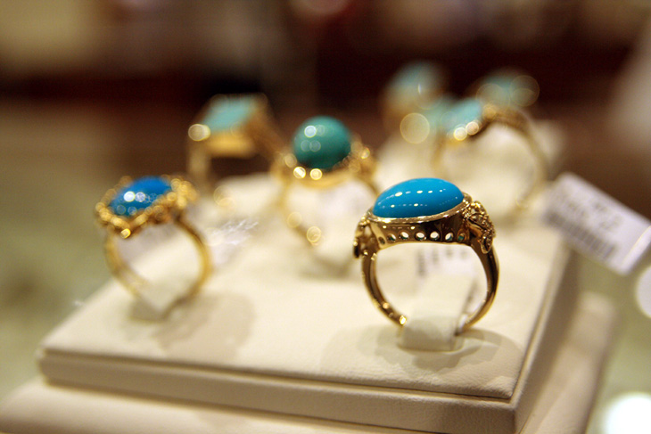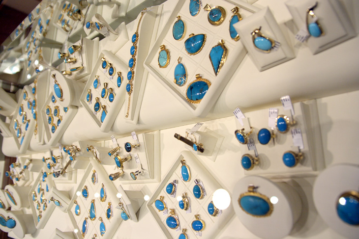 当たり前だけど店内はトルコ石だらけ!アクセサリー類にまるで興味のない僕は、とりあえずトルコ石の撮影を楽しみます。とはいっても、ここにおいてあるのは全て商品。勝手に撮影するのはまずいので、近くのトルコ人店員さんに「May I take a picture here?」と尋ねると、「すいません…日本語でいってもらえますか」と言われました(笑)。おいおい、日本語話せるのかよ~。結局後で気付いたのですが、7~8人いた店員さんの全員は日本語が話せたようです。