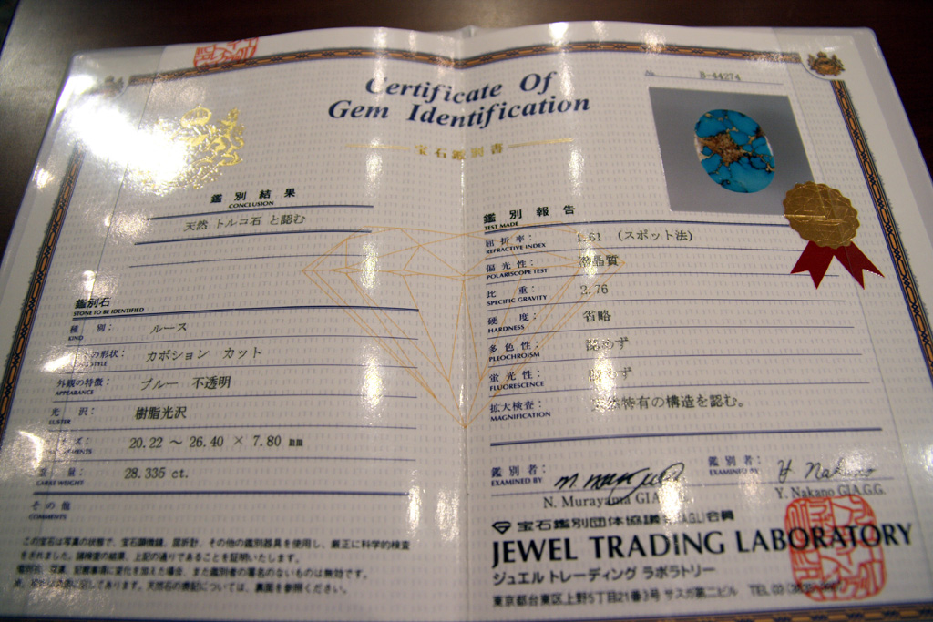 トルコ石を購入すると、そのトルコ石が本物であることを証明する「宝石鑑別書」がもらえるそうです。