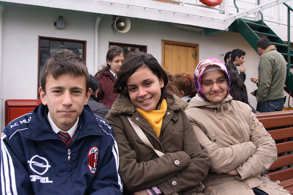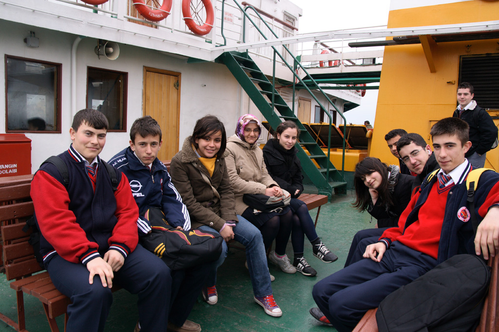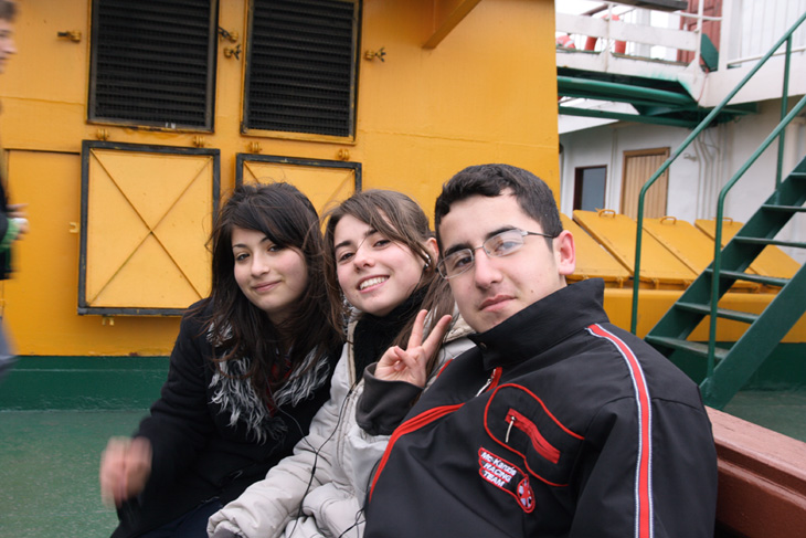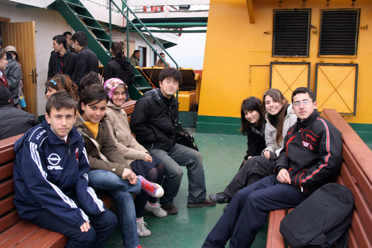 外は寒いので、多くの人は船内に入って暖まっていましたが、現地のトルコ人高校生たちは船外で元気に飛び回っていました。若いなぁと思いました。いや、待てよ、こういう天気の悪い時こそ、海なんてとっている場合じゃない!と思った僕は、高校生の群れに飛び込んでいって少しでも現地の人々と触れ合おうと思いました。まずは、挨拶代わりにパシャリ♪基本的にみんな元気だったけど、真ん中の女の子が特に元気がよくてかわいかったです(*゚ー゚*)ポッ 船の中から通っている高校が見えていたのでその場所を指差しで教えてくれました。チャナッカレにある高校に通っているそうです。