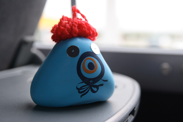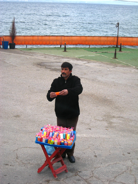 フェリー乗り場に着くと、変なおっちゃんがバスの前にやってきて商品の宣伝をしています。なんだか粘土みたいなモノをもって自在に顔を変身させています。最初は興味がなかったけど、段々と面白いおもちゃだなぁと思い始めます。しかし、バスごとこのままフェリーに入ってしまうので買えないのが残念です。このおっちゃん、バスがちょっとづつ前に進むたびについて来て、バスの前で宣伝を繰り返していました。買ってあげたかったです。