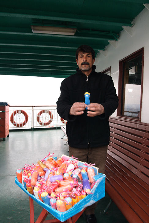 自分用は青♪口の部分が、ギョレメっぽくてお気に入りです。あとの4つはお土産用。さっそく、ぐにゅぐにゅ変形させて試してみたのですが、これがまたまた難しい…あのおっちゃんはいとも簡単そうにいろんな顔に変形させていたんだけどなぁ。練習が必要そうです。さて、次はいよいよダーダネルス海峡を渡ります。といっても、約30分程度のクルーズなのでそんなに長くは乗っていません。