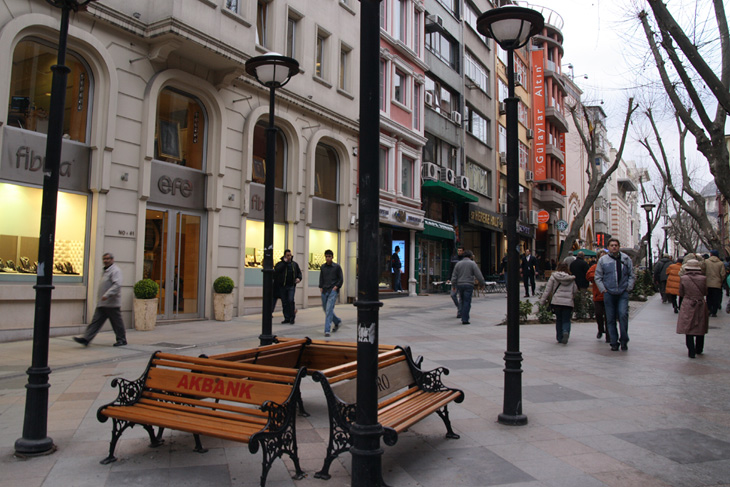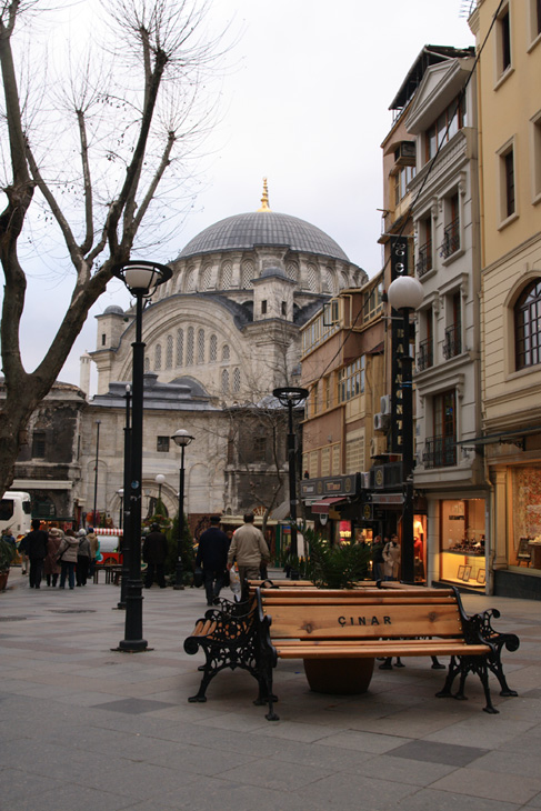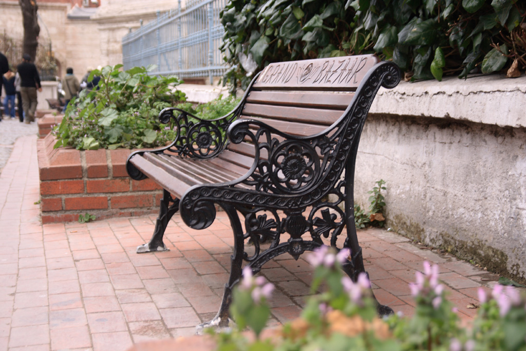 ヌルオスマニエ・ジャミイの通り沿いにあるベンチには、GRAND BAZAARの文字が。