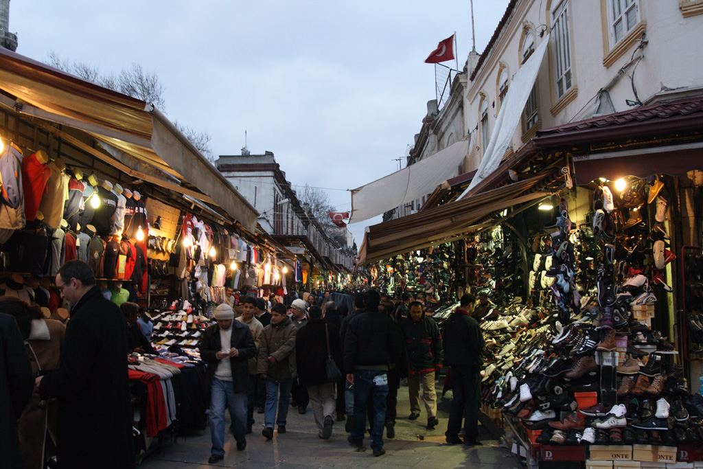 一つ目の門、ヌルオスマニエ・ジャミイの出口を抜けるとバザールの外にも関わらず多くの店が立ち並んでいます。商品が天井高くまで積み上げられている様はトルコ国内どこでも見かける光景。