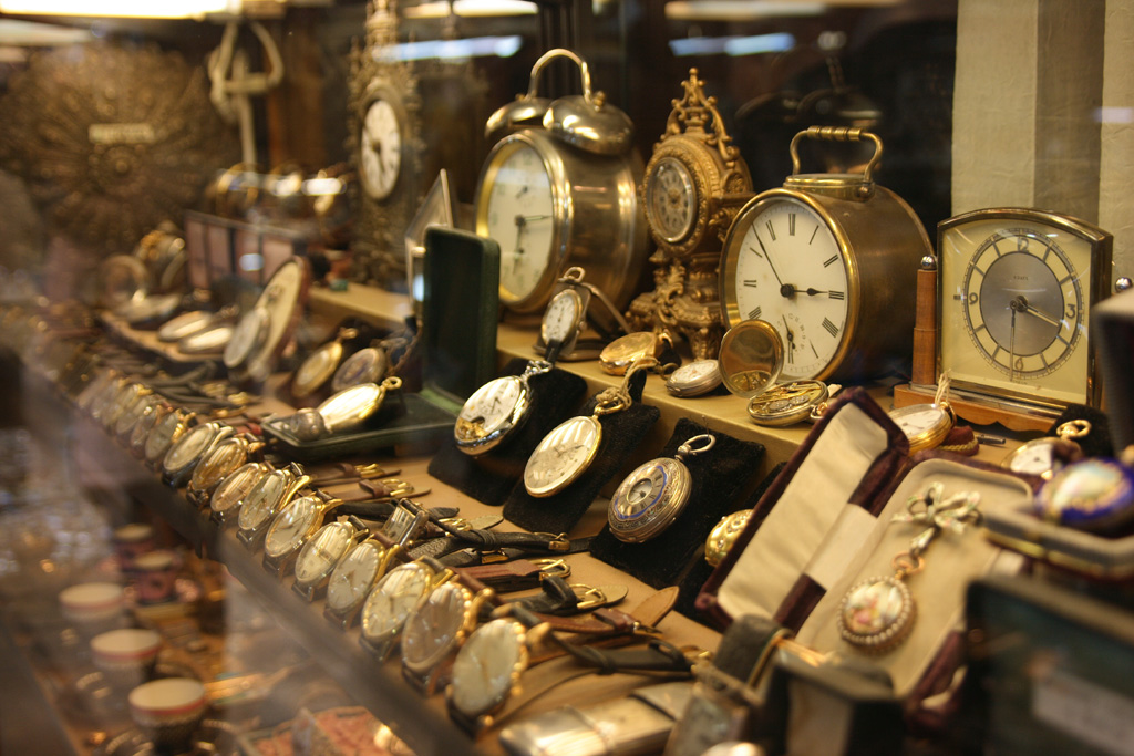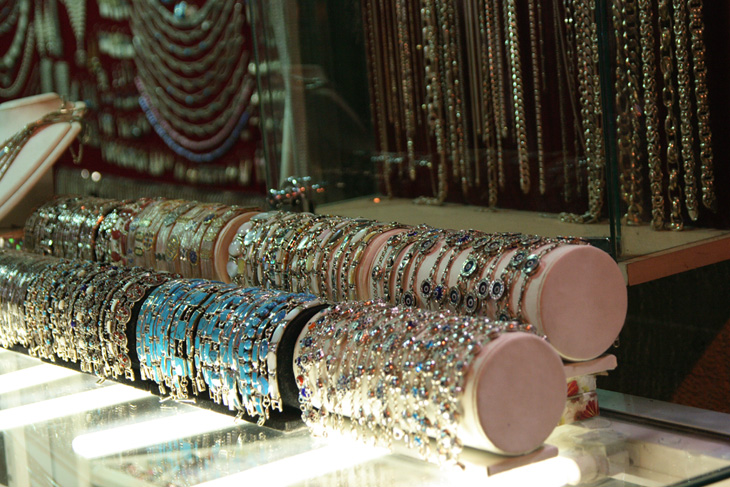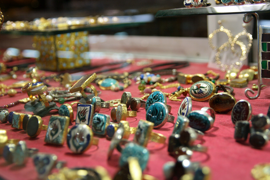 バザール内にどんなものが売られているのか簡単にみていきましょう。バザール内は、商品の各ジャンルごとに大まかにフロアが分けられており、金製品、銀製品、銅製品、アンティーク、お土産、カーぺット、衣料などとわかりやすいようになっています。とはいえ、ぼ~っと歩いていると何がどこにあるのかを探すのはわかりづらいと思いますので、ガイドブックにある地図などを参考に散策してみるとよいでしょう。写真真ん中の青いアクセサリーはトルコ石ですね。トルコ石には偽者もあるので、3個3000円のように安価で売っているような店は避けたほうが無難でしょう。
