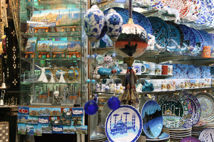 陶器・ガラス類です。トルコ定番のイズニック柄のお皿類もおみやげなどに最適です。だいたい、一皿15リラぐらいでしょうか。
