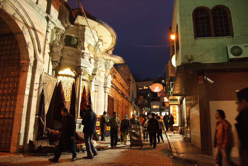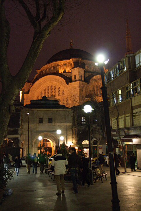 グランド・バザールをあとにします。遠くには、ライトアップされたヌルオスマニエ・ジャミイが見えています。イスタンブールにある建築物の多くは夜になるとライトアップされるので、夜景がとても綺麗になります。現在の建築技術は進化しているにも関わらず、このようなモスクを見ると本当は退化しているのでは…と思ってしまうのは僕だけではないはず。次は、ベリーダンスショーに向かいます。