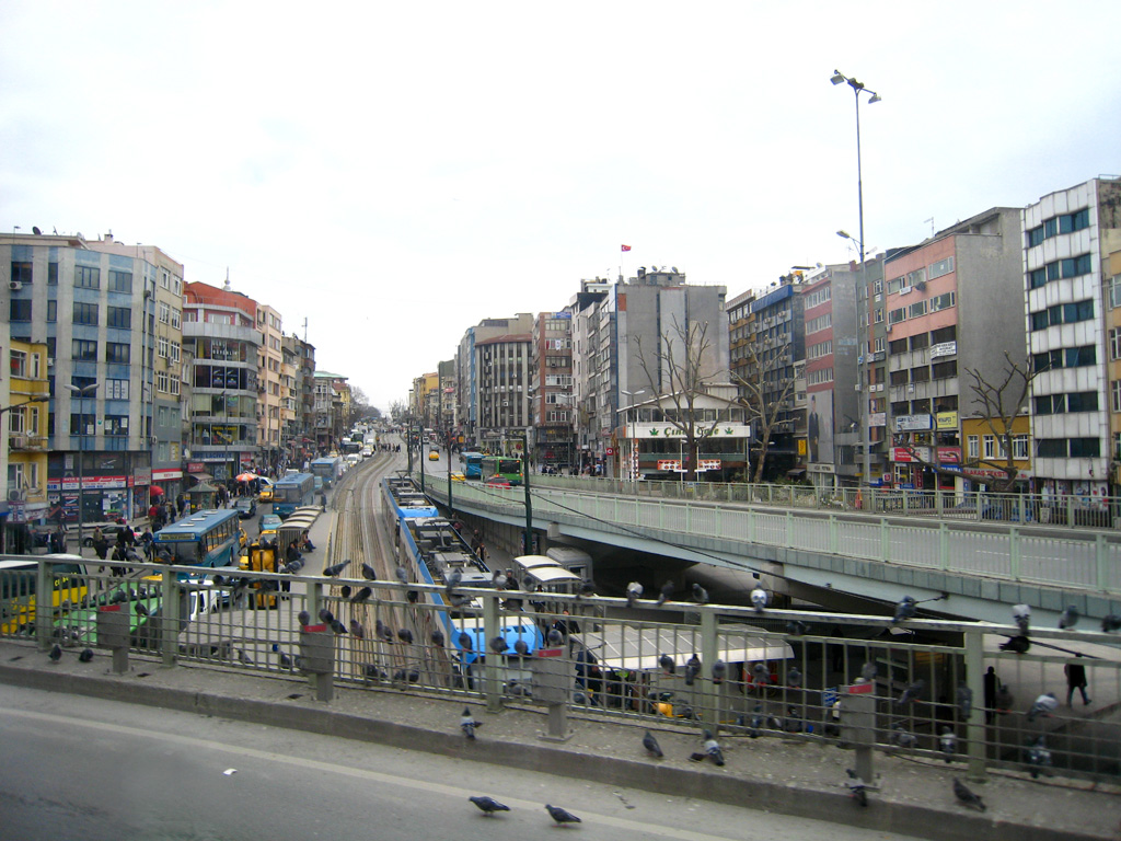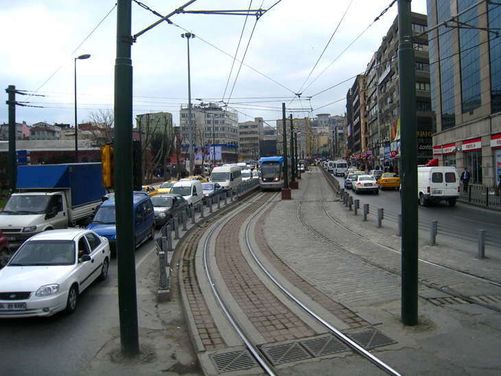 イスタンブールの交通機関の中で最も利用しやすいというトラムが見えてきました(写真の青い電車)。旧市街西の住宅地とアヤソフィアやブルー・モスクなどの観光ポイント、ホテルが集中するスルタンアフメット地区、シルケジ駅、エミノニュ、ガラタ橋を経由して、新市街のフンドゥックルを結んでいます。旧市街の主な観光ポイントはトラム沿いに集中しており、5分~15分の間隔で運行しているため、利用価値がとても高いです。駅と駅の間隔は短いので、次の駅までは歩いた方が早い場合もあるそうです。