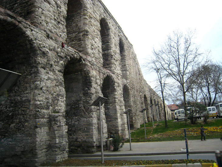 ヴァレンス水道橋が見えてきました。交通量の多い、旧市街のアタチュルク通りをまたぐようにして架かる巨大な水道橋です。378年、ヴァレンス皇帝の時代に完成、郊外から宮殿などのある中心部の地下貯水池まで水をひきました。建設当時は約1000m、現在は800m残っています。