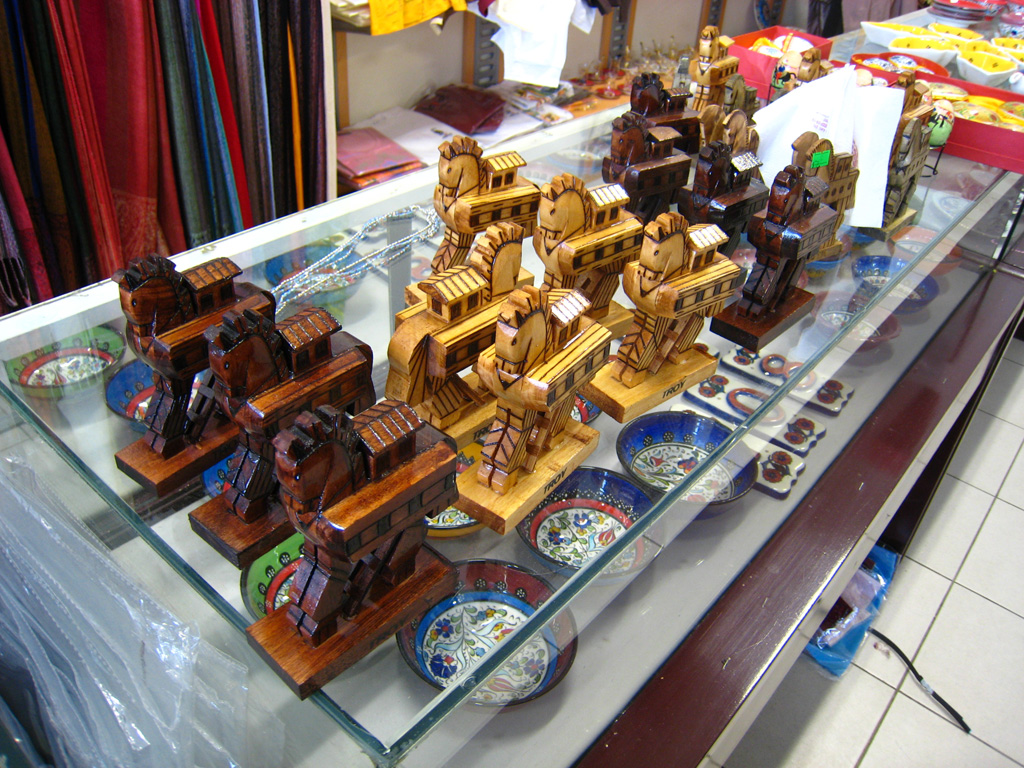 トロイのお土産もありました。このお店では円しか使えませんでした。3つ1000円のところを4つ1000円にまけてもらいました♪トルコで値引き交渉するときは、「ディスコント プリーズ」と言います。もともとがかなり高い値段に設定されているので「じゃぁ、買わない」とか「3つで○○リラなら買う」とかいえばかなり値引いてくれると思います。
