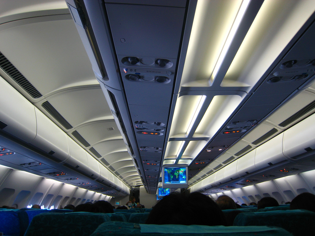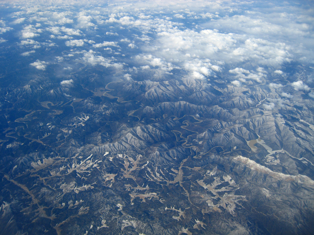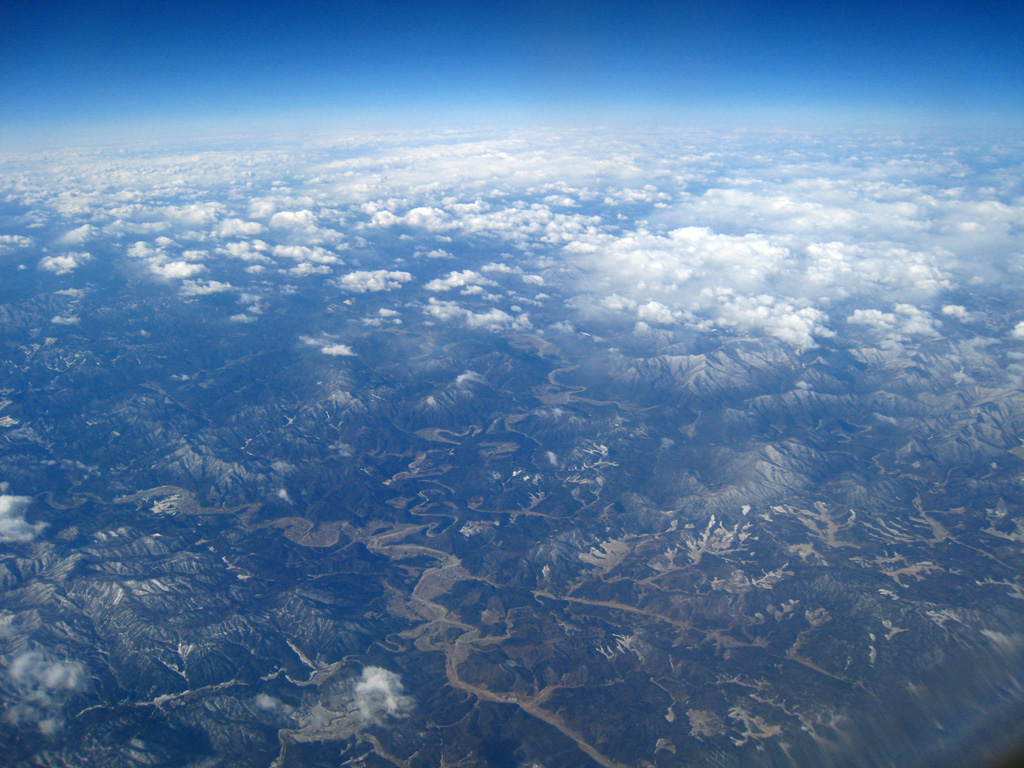 ちょうど中国と韓国の境目上空を飛んでいる頃、機内の最後尾に行って窓から外を覗いてみるととても綺麗な景色が広がっていました。