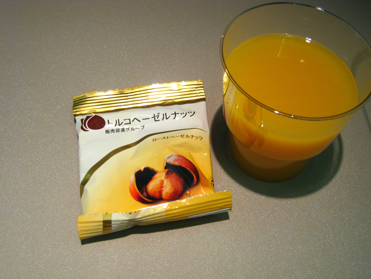 空港を出発してから1時間40分後、トルコのヘーゼルナッツがでてきました。懐かしい…。トルコに来る時も機内でヘーゼルナッツを食べました。今度は袋が日本語で書かれています。