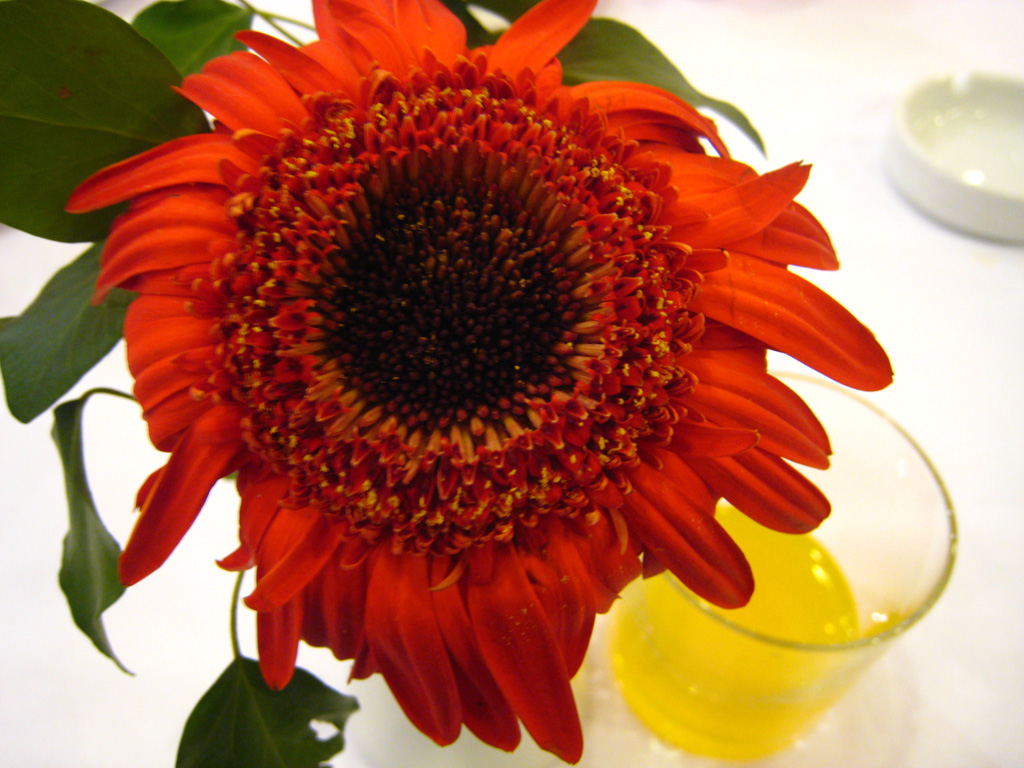 食卓には赤いひまわり(?)の花が飾ってありました。