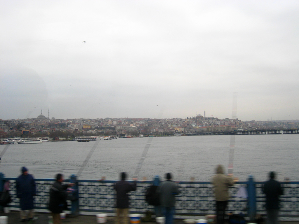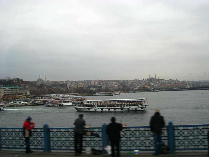 8時にホテルを出発。10数分後に、ガラタ橋が見えてきます。イスタンブールはガラタ橋を隔てて、旧市街側と新市外側に分かれています。昨日、観光していた場所は旧市街。今日、宿泊したホテルは新市街。今日はまた旧市街を観光する予定なので、ガラタ橋を再び渡る事になります。ガラタ橋には、釣りをする人がたくさん!これもまたイスタンブールのお馴染みの光景のようです。橋の下に広がる湾は、