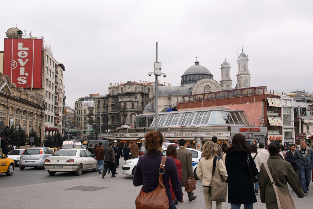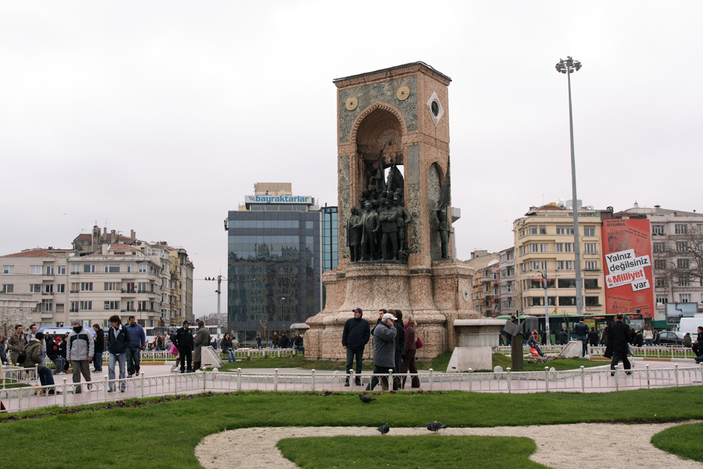 バスは、タクシム広場前に停車します。タクシム広場は、新市街の街歩きの起点となる有名な広場です。タクシム広場には、市バスのターミナルやドルムシュ乗り場があり、メトロも通っています。芝生の円形の広場は、車が行き交うロータリーになっており、1日中人と車で溢れ返っています。広場の中央に立っているのは、イタリアの彫刻家カノーニが造った独立記念碑。ギリシャへの戦闘を決意したアタチュルクの彫刻も立っています。中央に立っているのがアタチュルクです。