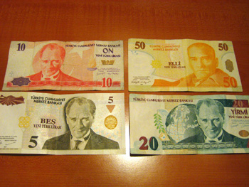 トルコの通貨は、2005年1月のデノミ(通貨の切り下げ)実施に伴い、新紙幣が発行されました。新トルコリラ(単位はYTL)は、100リラ、50リラ、20リラ、10リラ、1リラの6種類。